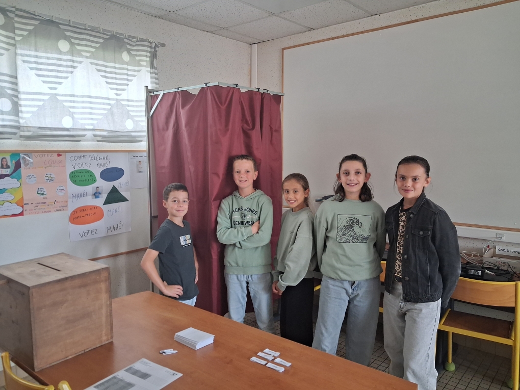 Mahé, Maël, Louise, Izia et Louison se sont présentés pour être délégués cette année. Leur programme était prometteur pour chacun d’entre d’eux ! Tous les élèves de la classe ont voté ainsi que Laurence et Karine. Ce sont Louise et Mahé qui ont obtenu le plus de voix. Félicitations à eux deux pour leur élection