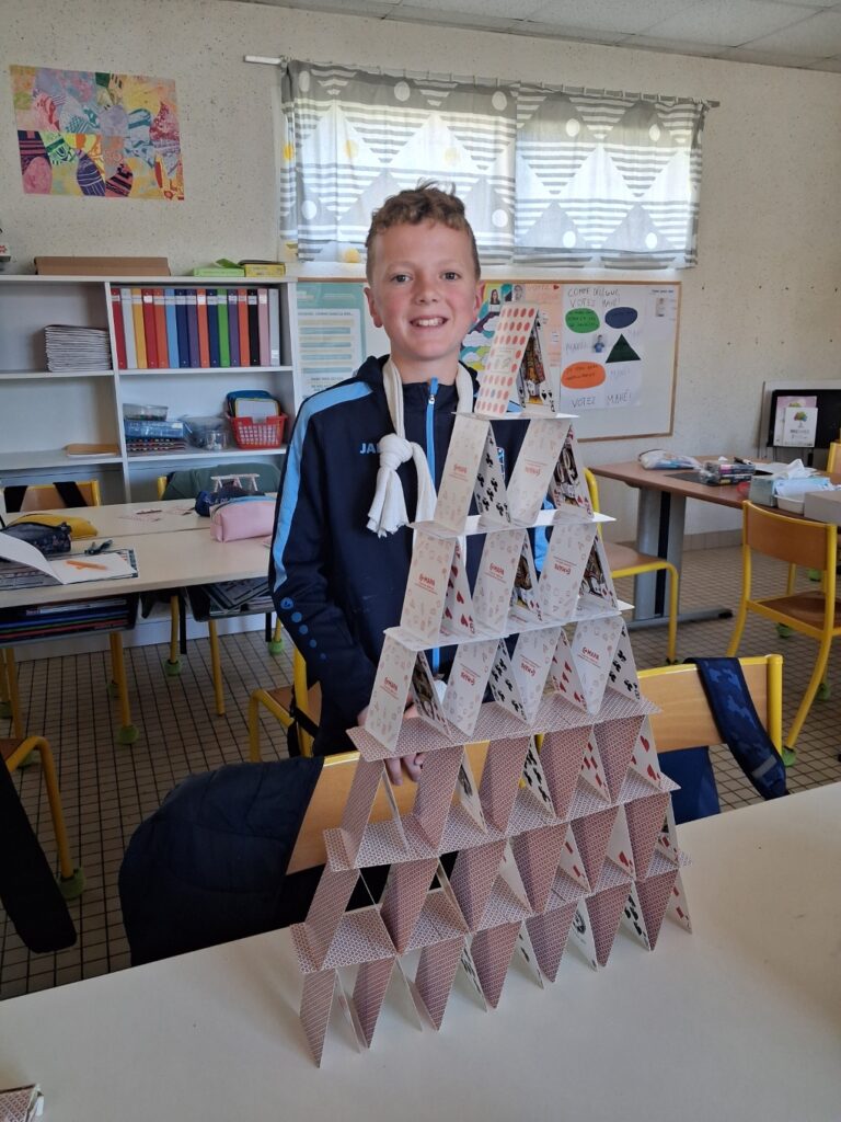 Les élèves de CM1 et CM2 se sont amusés à construire des châteaux de cartes ! Bravo à Maël pour cette belle réussite ! Il a fait preuve de patience, de calme et de motricité fine !
